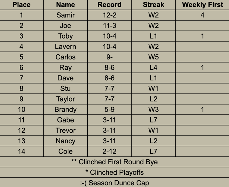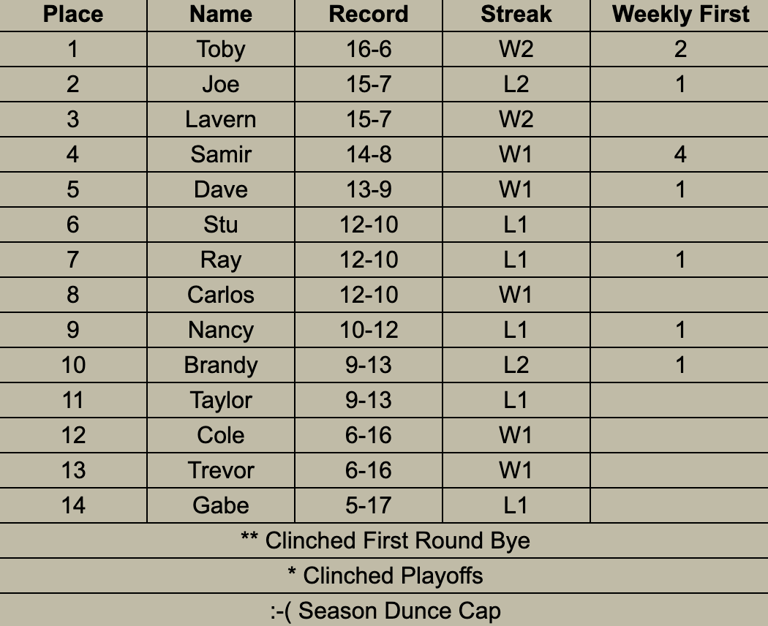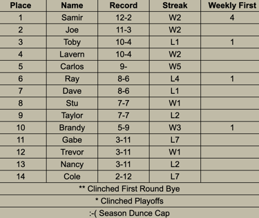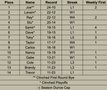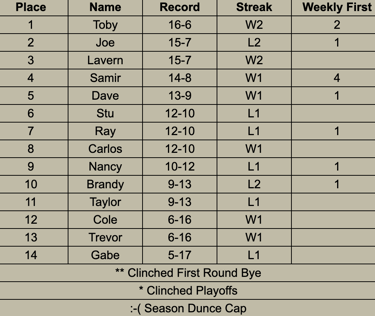 Results of these standings may change in the final two weeks of the regular season when the first tie breaker is factored in. If two people are tied in record the first tie breaker is their record against each other, if they are still tied it goes to points. If three or more people are tied it goes directly to points.