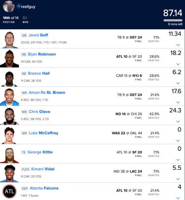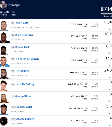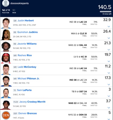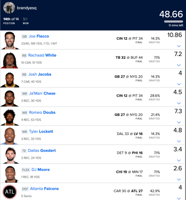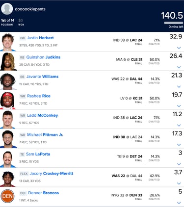 This year we added two spots to the league. There are now 14 people in the league. Rather than keep six playoff spots, this year we will be trying 7, to keep the it at 50% of the league. Since there is an odd number of people making the playoffs, we will be adopting the NFL's playoff format. 7 teams make the playoff and only the #1 seed gets a bye week. So the #2 seed would play the #7 seed, #3 plays #6, and # 4 plays #5.