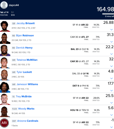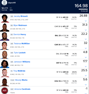 2. Each week your match up will be posted on this site. Make sure you only enter the match with your name on it. We will once again be using the Fanduel league system however if for any reason an issue arises that requires us to revert to our old system here is how it works: You will see a match up for 3 players. I am putting myself in each match up so I can keep track of Win/Loss, points, and making sure both players join. My score will only matter against the person I am actually matched against for the week.