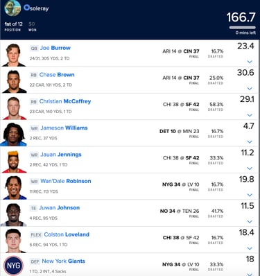 4. If you forget to set or save your lineup it is a loss, however I will let you know and if you respond to my text I will set up an afternoon match so you can still accumulate tie breaker points toward the end of the season. These points can be the difference between a playoff spot and just missing it so if you screw up at least take advantage of this offer. THE BEST WAY TO AVOID THIS THOUGH IS TO JUST MAKE SURE YOU SET YOUR LINEUP AND DOUBLE CHECK THAT YOU SAVED IT. TEXT ME AFTER YOU SET YOUR LINEUP EACH WEEK AND I WILL CONFIRM THAT IT IS SET.